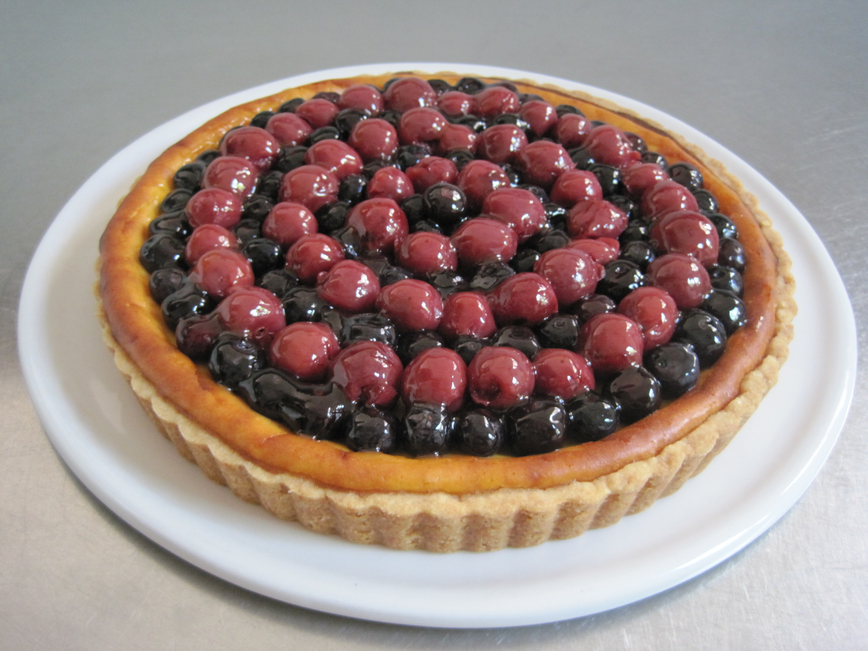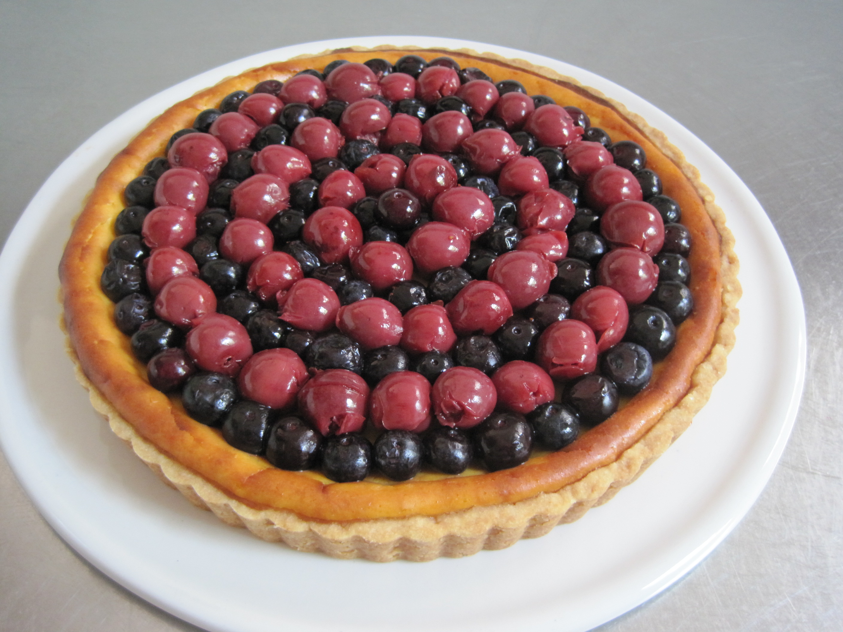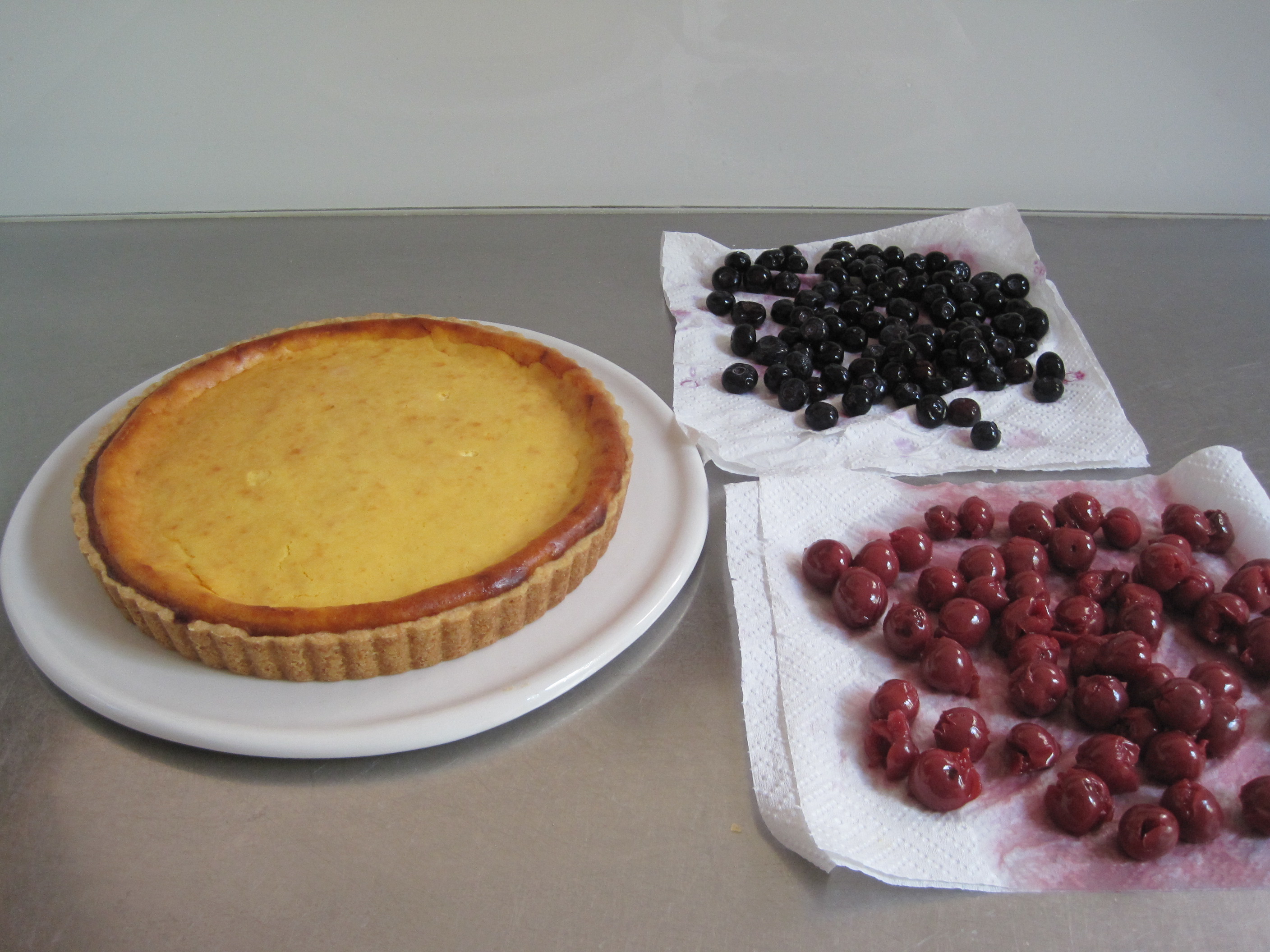 This recipe was taken from a newspaper article when I first baked it (according to the exact instructions). I almost wept when I saw the rapid deflation. Then I thought of a solution…I would fill the gaping cavity with berries. This has now become an essential part of the tart as the edge of the filling forms a golden halo around the berries. I have also changed the original recipe to make the filling fool-proof. The original recipe took 2 hours to bake, used lots more ingredients and wasted some. It made me wonder if it was ever tested by the person who wrote the article.