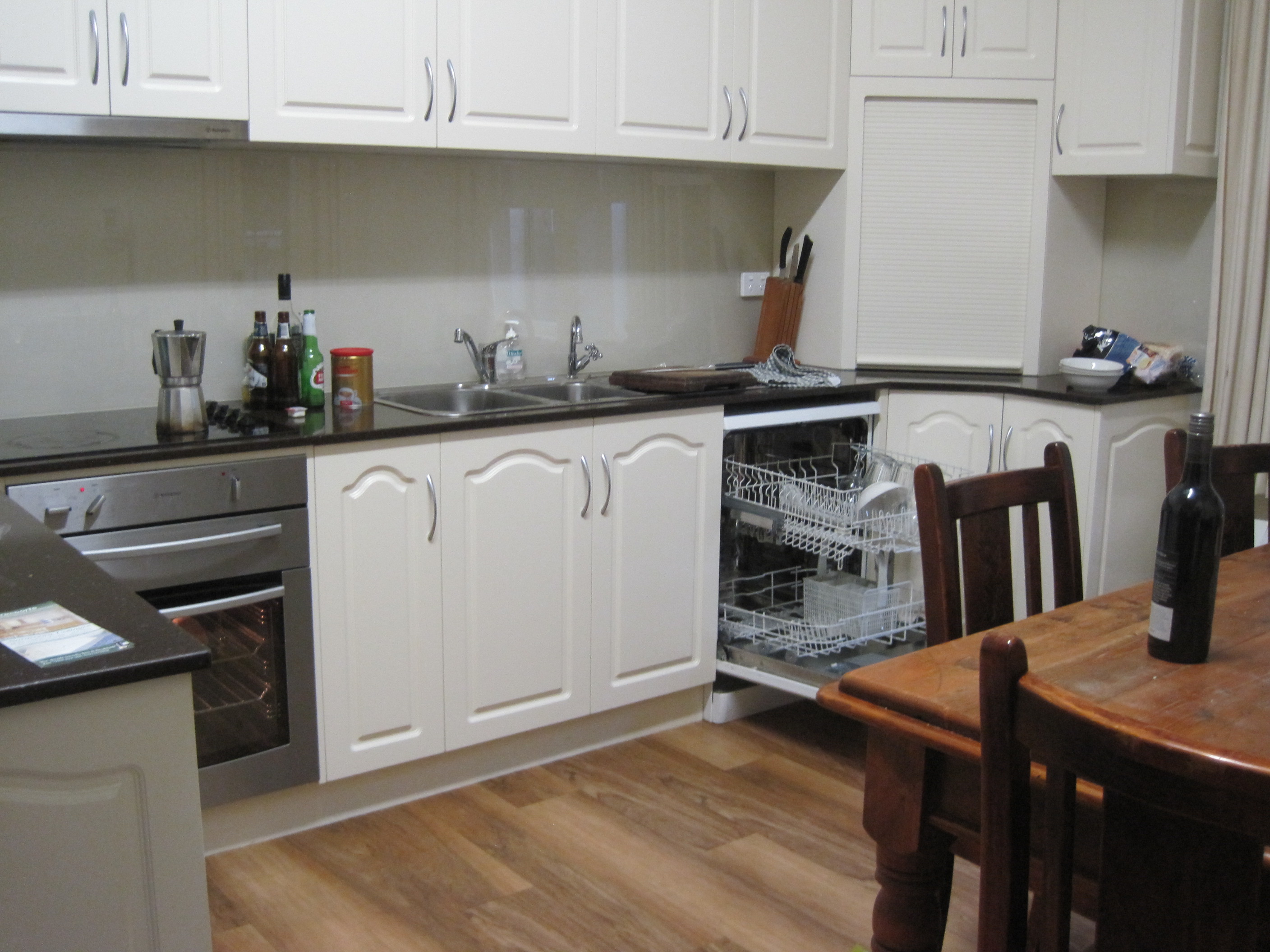 IMG_5652Toward the back of the house was a huge kitchen with a lovely 10 seater  dining table. The owner had been generous in stocking the cupboards and fridge. Real butter, a choice of milks, jams and condiments, vinegars, olive oil, a gorgeous hamper of breakfast goodies and a welcoming bottle of the local wine.
