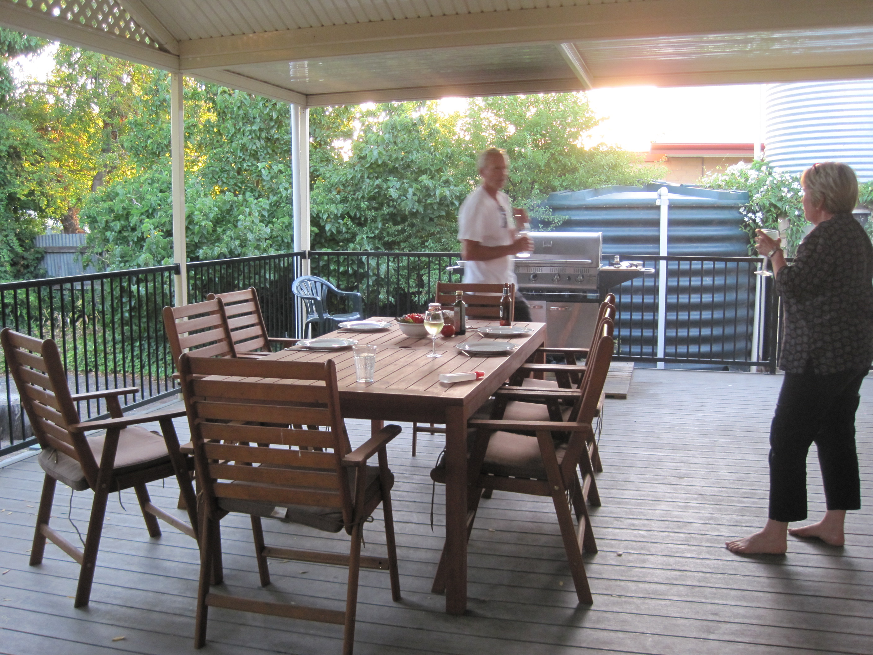 IMG_5653As the sun set and the night cooled we decided to sit outside under the veranda. The boys took up their rightful place at the barbecue and Karyn brought me a glass of chilled Riesling. We sat and talked about what we might do with the Mulberries.