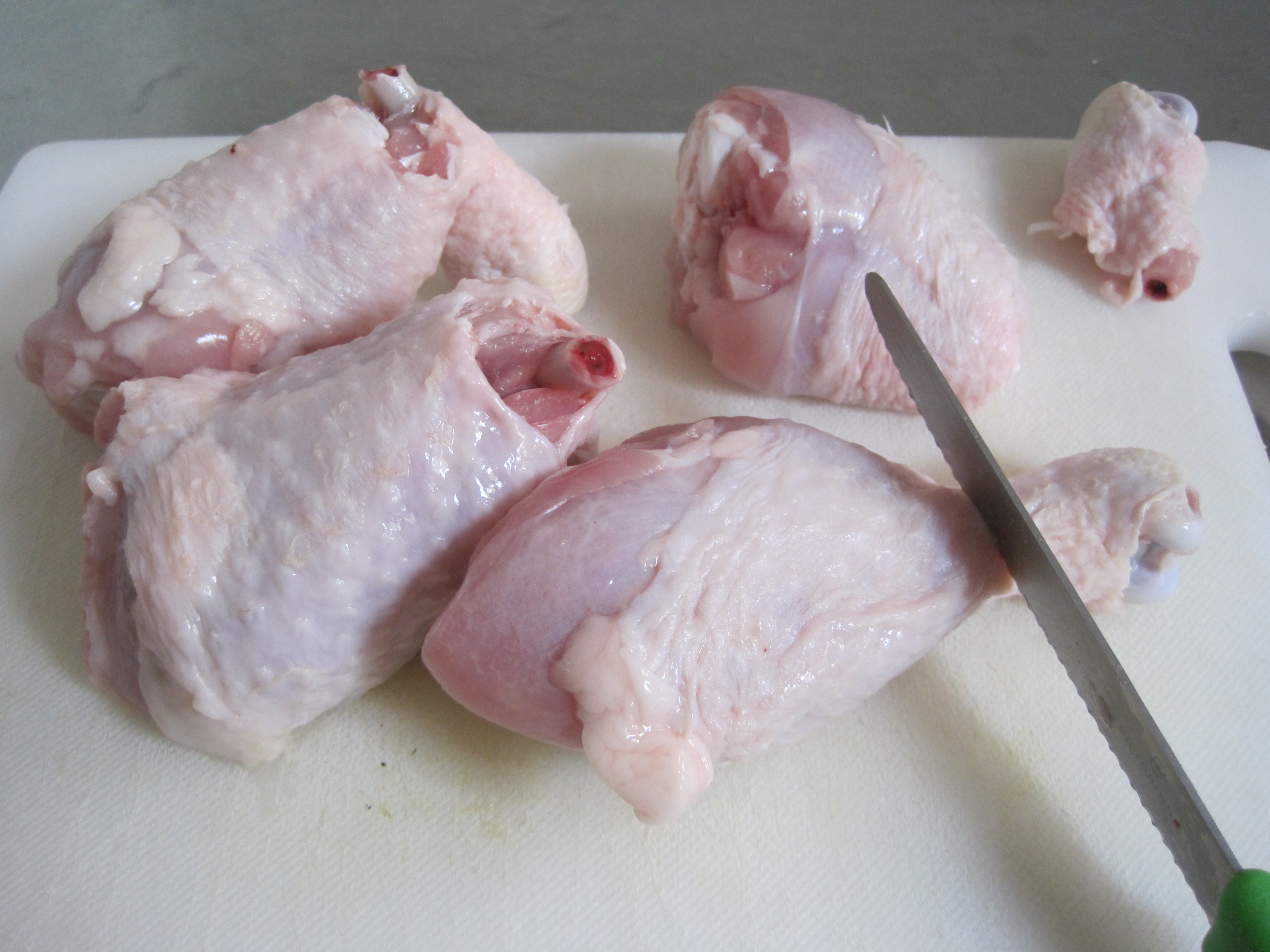 IMG_4480[1]1-First remove knobbly joint of leg bone by scoring with a serrated knife then snapping off weakened bone. I do this because the whole leg takes up too much room and this dry old joint doesn’t look so good or add much flavour. Instead of discarding bones I put them in a zip lock bag, freeze and use later for stock in soups and sauces.