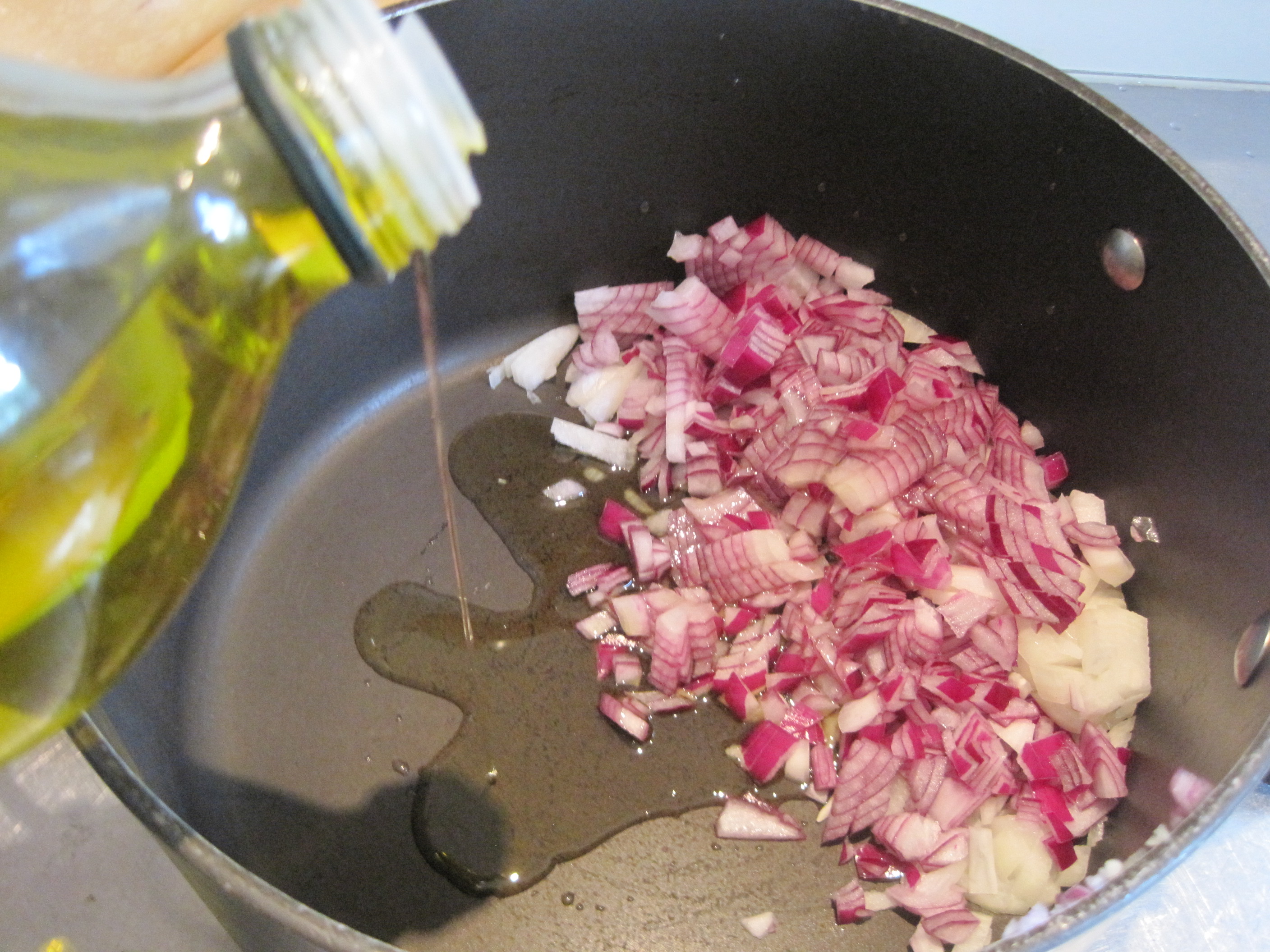 2-Place onions in large saucepan with olive oil and fry on low heat till transparent.