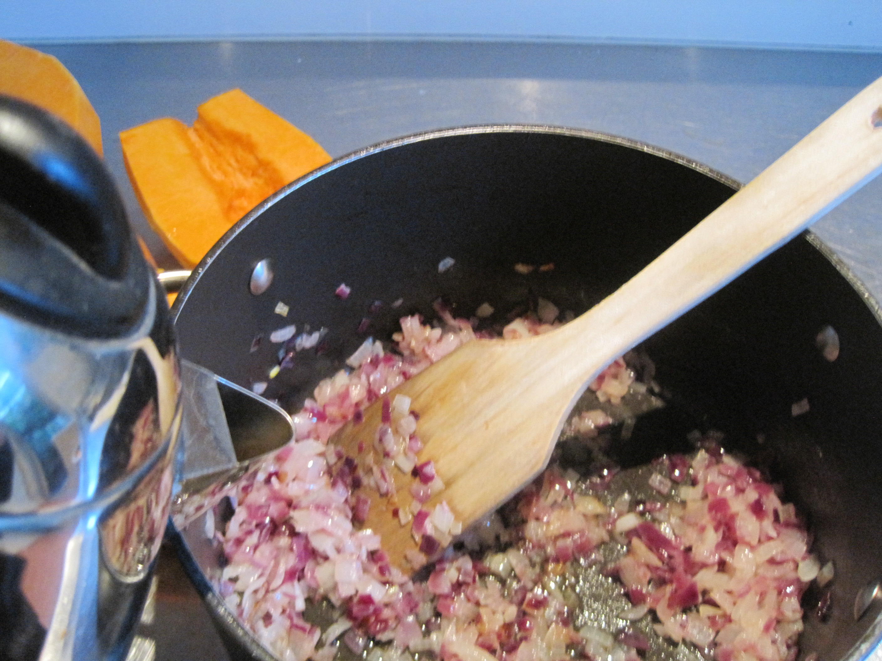 7-Add water to onions, then add pumpkin.