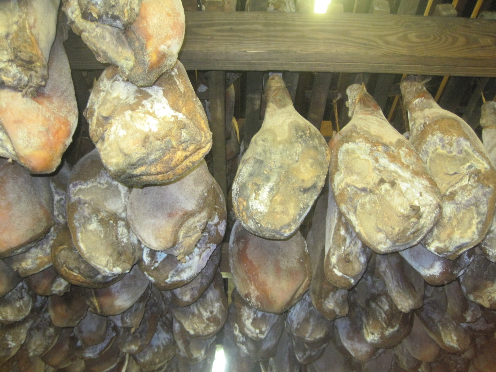 Our eyes adjusted slowly to the dark, smoke blackened space and we looked up to see layer upon layer of pork legs hanging from the rafters. Curing was DeeDee’s speciality and today she was going to reveal the secrets of her much sought after hams.